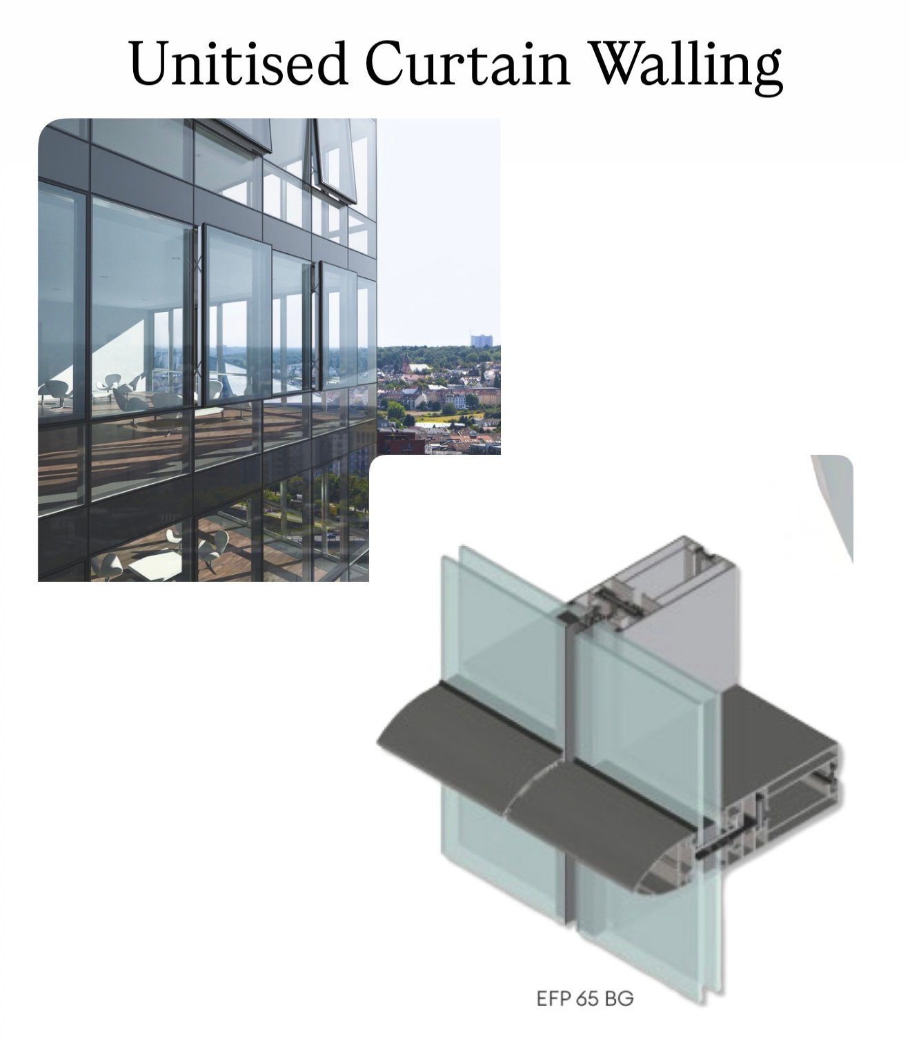 The EFP 65 Unitised System enables the construction of attrac- tive curtain walling with a high degree of freedom in design. This is with the benefits of vertical and horizontal sightlines of 15mm only! The thermally broken system is fully drained and pre...